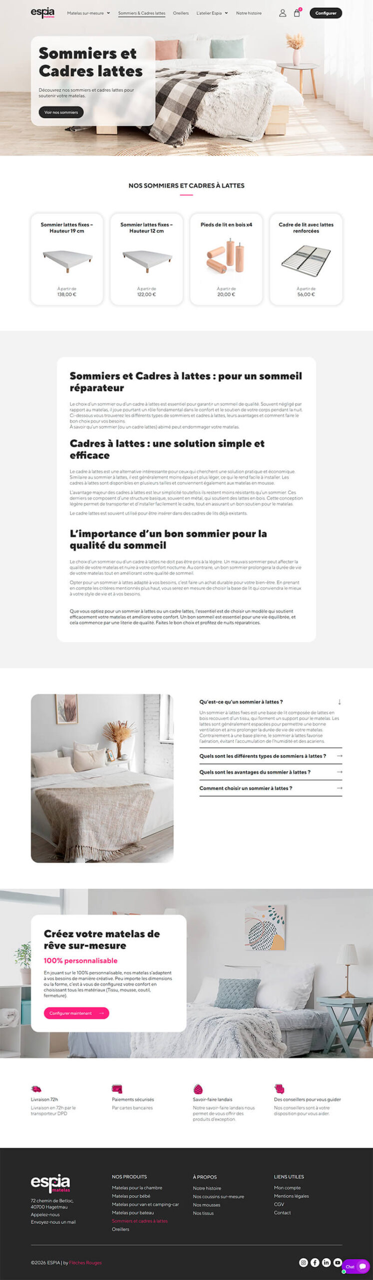 La plateforme e-commerce intègre également la vente de produits complémentaires (sommiers, coussins), une gestion complète des commandes, des paiements sécurisés et des modes de livraison adaptés. Une attention particulière a été portée à la clarté du parcours d’achat, à la performance technique et à l’optimisation SEO, afin de soutenir la visibilité et la conversion.