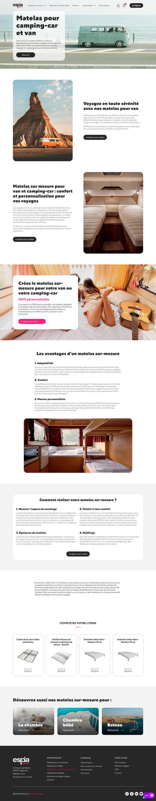 La marque Espia a été créé en 2016 pour servir le marché des particuliers avec des coussins et des matelas sur-mesure. Après un développement sur les coussins sur-mesure, ils ont décidé, forts de leur expérience et de leur savoir-faire, de créer des matelas 100% personnalisable par le client.