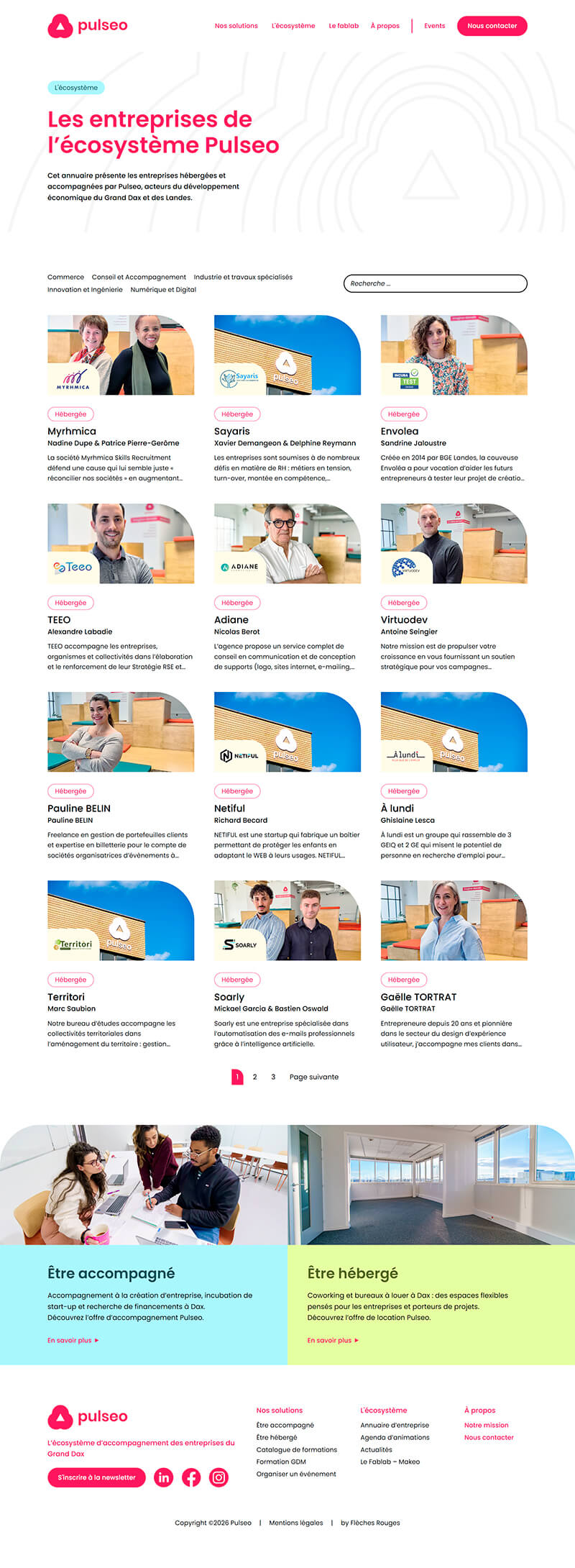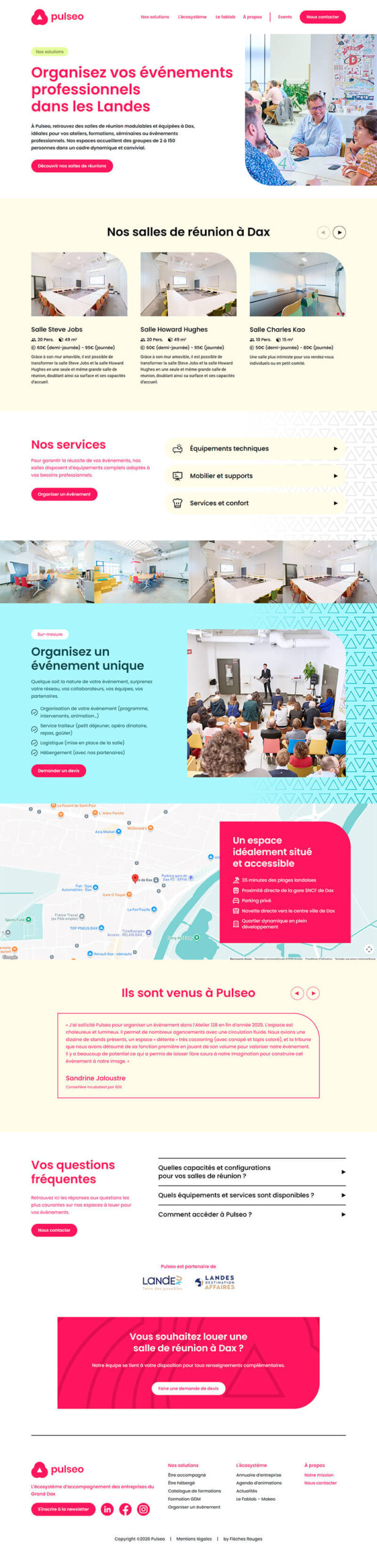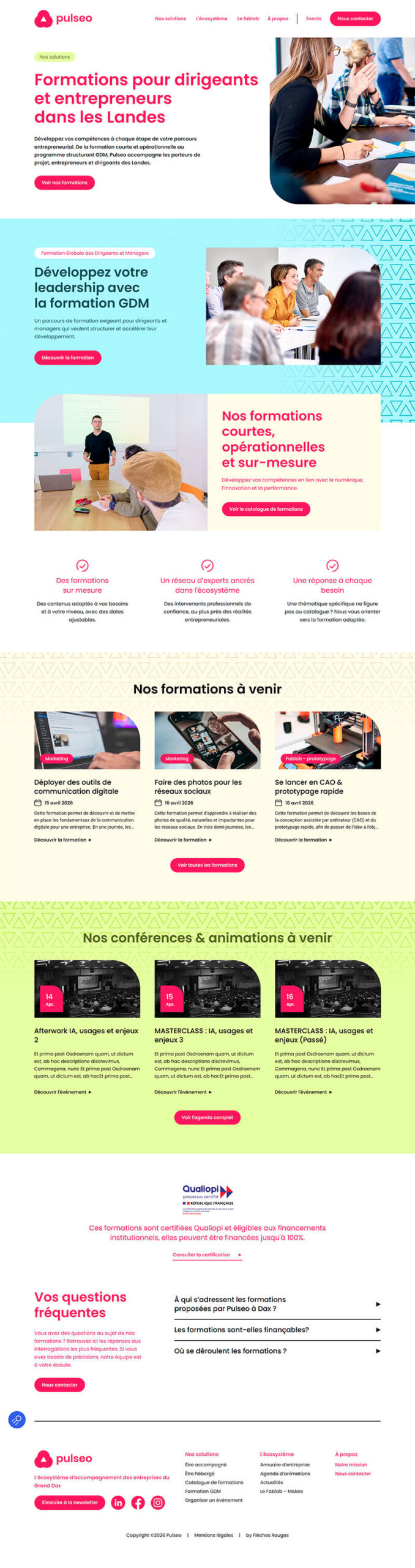 Pulseo est une épinière d’entreprises du Grand Dax dédiée à l’accompagnement des entreprises et des acteurs économiques, proposant des services, formations et événements autour du développement professionnel. La plateforme centralise un écosystème complet incluant catalogue de formations, agenda d’événements, annuaire d’entreprises et contenus éditoriaux, afin de favoriser la mise en relation et le partage de compétences.